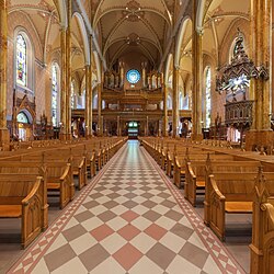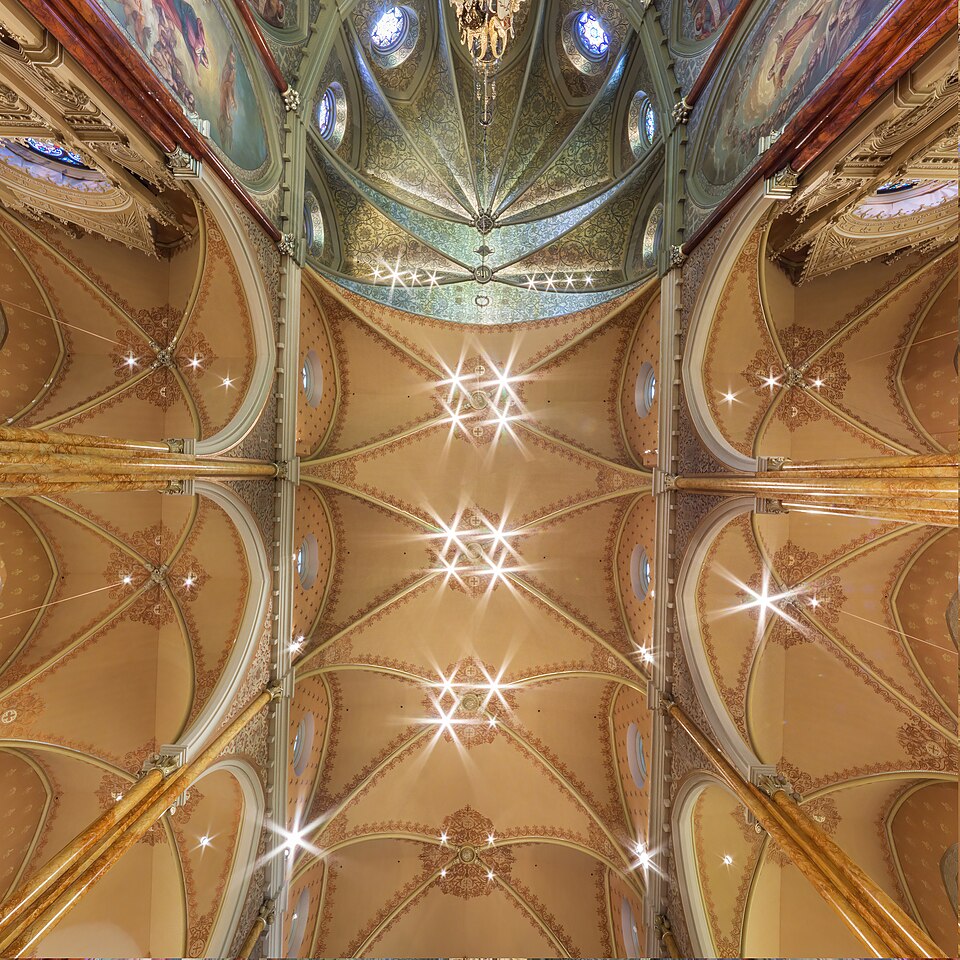 As an example, consider, File:Panorama 360 of Basilique Saint-Patrick, Montreal, Quebec, Canada.jpg. In equirectangular projection it looks like